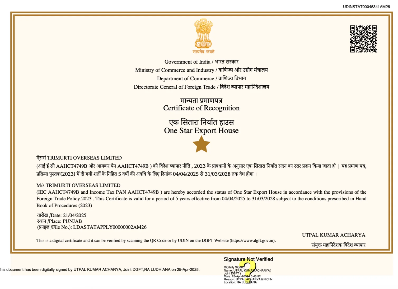 One Star Export House – recognized exporter under the Government of India.