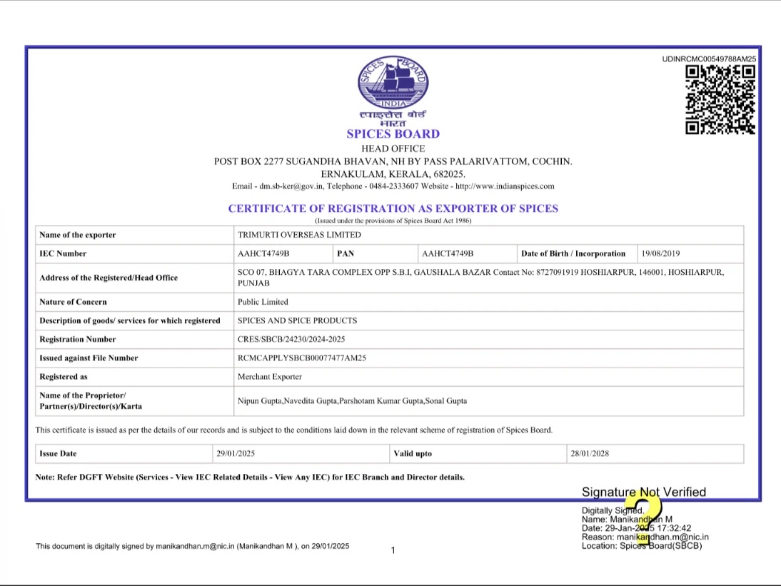 Spices Board Certification – approved exporter under the Government of India.