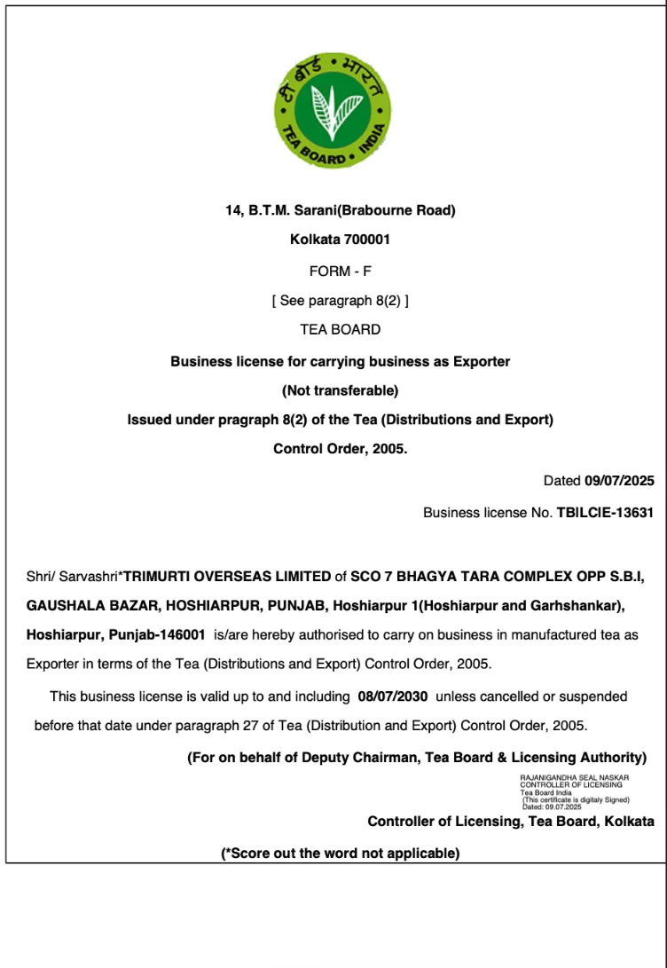 Tea Board of India – certified for tea trade, distribution, and export.